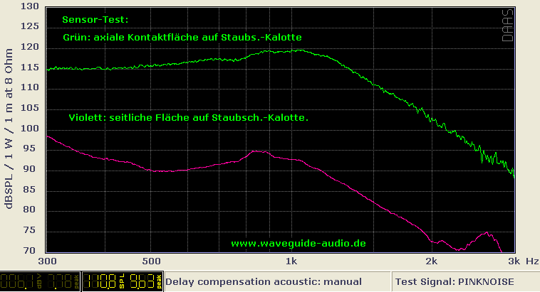 Wie zu sehen ergibt sich hier nun nicht einfach nur ein geringerer Pegel, wenn der Sensor falsch, also um 90 Grad um seine Achse gedreht angewendet wird. Sondern: es zeigen sich in den aufgenommenen Frequenzgängen, ganz heftige Unterschiede.