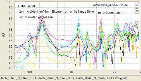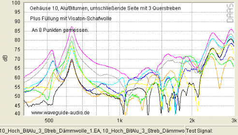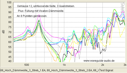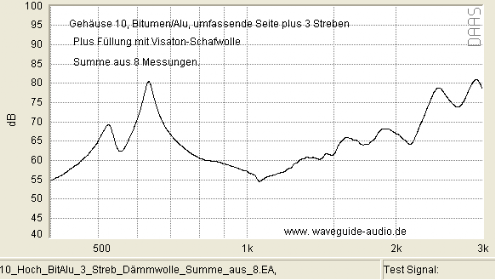 Gelegentlich wird im Internet bezüglich ausgesteiften Gehäusen vermutet, gehofft oder befürchtet, damit würden Vibrationen in einen höher frequenten Bereich verschoben. Was je nach Sichtweise wünschenswert, oder besonders schlimm wäre. Der Vergleich unten (bei dem ist keine Dämmwolle im Spiel) weist (bis auf kleine Ausnahmen bei 2.500Hz) nicht darauf hin: