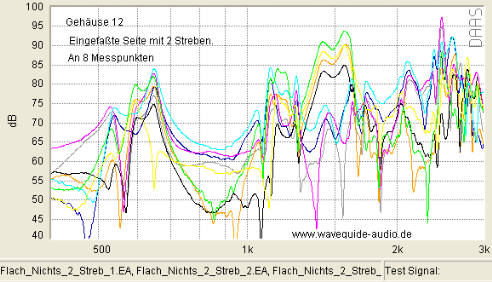 Die Kraft, die Gehäusewände zum Schwingen/Vibrieren bringt, sind die Druckknoten der verschiedenen stehenden Wellen. Die sich in Abhängigkeit von den inneren Gehäuse-Dimensionen halt so aufbauen. Queraussteifungen ändern grundlegend nichts an den Gehäuse-Dimensionen. Weshalb die Frequenzen der Stehwellen also auch praktisch gleich bleiben. Somit auch keine Sachlage gegeben ist, dass ausgesteifte Gehäuse, auf theoretisch viel höheren Frequenzen vibrieren würden.